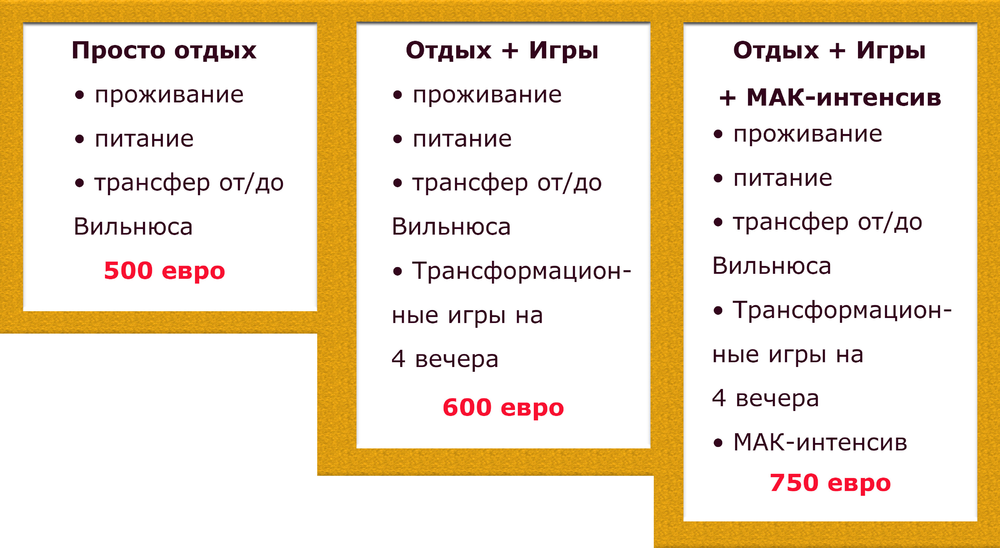 - МАК-интенсив на 4 дня (по 3 часа в день) + участие в трансформационных играх (на 4 вечера) – 250 евро с человека.