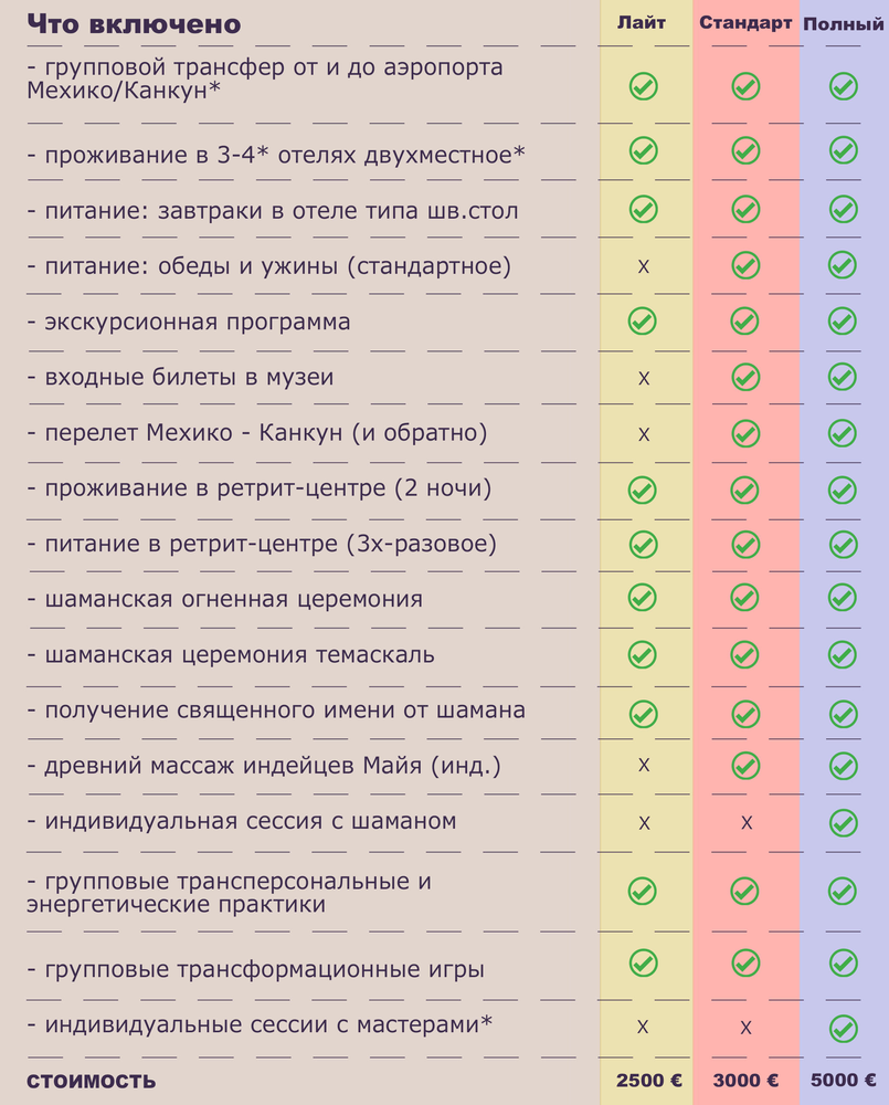 *-В зависимости от того, в какой город вы прилетаете и из какого города вылетаете, мы можем оплатить расходы на внутренние перелеты между городами Мехико и Канкун (уточняйте по телефону +79629900833)