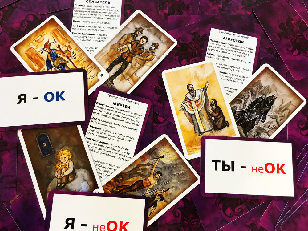 - 6 вспомогательных карт для работы с конфликтами (треугольник жертва-агрессор-спасатель)